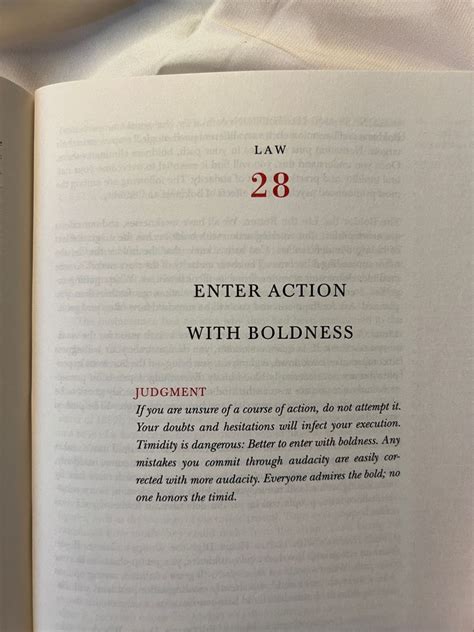 Law 28: Enter Action with Boldness. When you enter a situation, do it with confidence. Hesitation breeds doubt. It’s like going on stage. If you walk on hesitantly, the audience won’t be convinced. Boldness gets people’s attention, and it can help you get what you want.