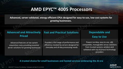 SMBs often face the challenge of balancing performance and cost when it comes to their IT infrastructure. The AMD EPYC 4005 series is an ideal solution for SMBs that need a reliable and high-performing server without breaking the bank. These processors offer the scalability and security features that SMBs require, allowing them to run their business applications and services smoothly. The AMD EPYC 4005 series provides SMBs with a cost-effective way to upgrade their server infrastructure and improve their overall IT capabilities. With options ranging from 4 to 16 cores, SMBs can choose a processor that perfectly matches their workload requirements and scale up as their business grows. This flexibility ensures that they are not paying for more processing power than they need, while also providing the ability to adapt to changing business needs. The advanced security features of the AMD EPYC 4005 series , such as SEV and Secure Boot, help to protect SMBs from data breaches and other security threats. This is crucial for SMBs that handle sensitive customer data or operate in regulated industries, where security breaches can have significant financial and reputational consequences. The AMD EPYC 4005 series provides SMBs with a secure and reliable server platform that they can trust.