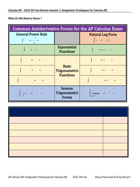 For instance, consider the integral of ∫2x * cos(x^2) dx. Let u = x^2, then du = 2x dx. We can rewrite the integral as ∫cos(u) du, which is simply sin(u) + C. Substituting back, we get sin(x^2) + C. U-Substitution is a powerful tool for tackling more complex integrals, and mastering it is essential for the AP Calculus BC exam. Practice identifying suitable ‘u’ values and working through various examples to become proficient in this technique.