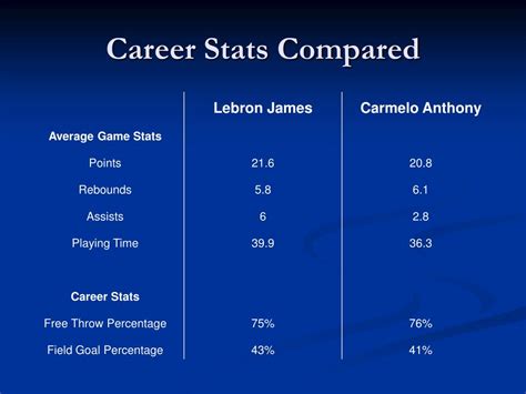 Hey guys, let’s dive into a seriously cool matchup: Carmelo Anthony vs LeBron James . These two NBA legends have graced the court for years, putting on some incredible performances. When you think about comparing player stats, especially for guys who played at such a high level for so long, it’s always a fascinating exercise. We’re not just looking at raw numbers here; we’re talking about career arcs, impact on the game, and how their individual brilliance stacked up against each other throughout their storied careers. Both are titans of the game, known for their scoring prowess and unique styles. Melo, with his silky-smooth offensive game and deadly mid-range jumper, and LeBron, the all-around force of nature, dominating every facet of the game. It’s a comparison that basketball fans have debated for ages, and one that’s worth revisiting with a closer look at their statistical profiles. We’ll be breaking down their scoring, efficiency, playmaking, and overall impact to see how these two giants truly measured up.