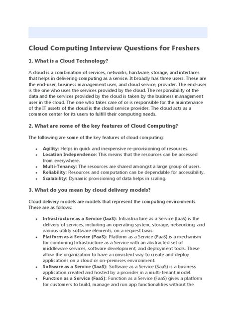 • What is cloud computing? This is a classic. Keep your answer clear and concise. Focus on the on-demand delivery of IT resources over the internet with pay-as-you-go pricing. Mention the key characteristics: scalability, elasticity, self-service, broad network access, and resource pooling . Think about the different service models: IaaS, PaaS, and SaaS . Briefly explain what each one means and give an example. For instance, IaaS is like renting the raw infrastructure (servers, storage), PaaS is for developers building apps without managing the underlying hardware, and SaaS is ready-to-use software like Gmail or Office 365.