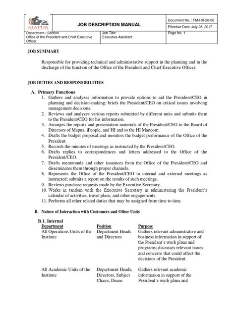 Okay, let’s break down the core duties you’d be tackling as an executive assistant to the president. Schedule management is definitely at the top of the list. We’re talking about coordinating a crazy busy calendar, making sure the president is where they need to be, when they need to be there. That includes booking meetings, travel arrangements, and managing speaking engagements. Communication is also huge . You’re the point person, relaying messages between the president, other executives, and external contacts. You’ll need to be clear, concise, and always professional. Handling confidential information is another biggie. You’ll be privy to sensitive company data, strategic plans, and personnel matters. Discretion is key; you need to be a vault. Preparing reports and presentations will also fall under your purview. This might involve research, data analysis, and creating visually appealing materials. You’re helping the president communicate effectively. You’ll also be coordinating board meetings. This means preparing agendas, distributing materials, and taking minutes. It’s all about making sure these crucial meetings run smoothly. Last but not least, project management. You might be tasked with overseeing various projects, ensuring they stay on track and within budget. It’s a lot to juggle, but that’s what makes the role so dynamic.