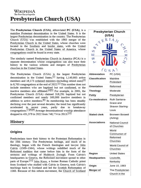 Hey everyone, let’s dive into the Presbyterian Church (USA) , or PC(USA) as it’s often called. This is a mainline Protestant denomination, a big player in the religious scene in the United States, and it’s got a pretty rich history and a diverse community. We’re going to explore what makes the PC(USA) tick, from its roots in the Reformation to its current stances on social issues. If you’re curious about different Christian denominations, or maybe you’re just wondering about the PC(USA), then you’re in the right place. We will touch on its beliefs, how it’s structured, and its impact on the wider world. So, grab a coffee, and let’s get started!
