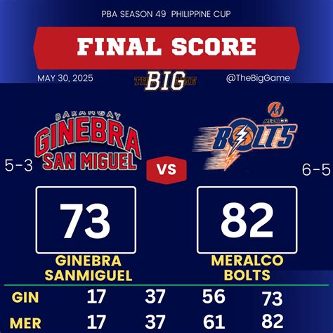 Hey sports fanatics! Let’s dive deep into the electrifying world of Philippine basketball, specifically the highly anticipated clash between the Barangay Ginebra San Miguel and the Meralco Bolts . We’re talking about a rivalry that consistently delivers nail-biting finishes, passionate fans, and unforgettable moments. This article is your ultimate guide to breaking down the final score, dissecting the key plays, and analyzing the overall performance of both teams. Get ready for an action-packed journey through the highlights, the lowlights, and everything in between. We’ll examine the strategies, the player matchups, and the crucial turning points that shaped the final outcome. Whether you’re a die-hard Ginebra fan, a loyal Meralco supporter, or simply a basketball enthusiast, this comprehensive analysis is designed to keep you informed and entertained. Let’s get started and unpack all the exciting details!