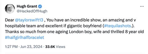 Now, let’s get into the nitty-gritty of what Hugh Grant actually said about Taylor Swift on Twitter. It wasn’t just a simple “Taylor Swift is great.” Oh no, Grant, being the eloquent and often hilariously witty man he is, went into a bit more detail, and it’s pure gold. He specifically highlighted Swift’s performance at Glastonbury , which, if you recall, was absolutely phenomenal. He didn’t just say she was good; he used phrases that really emphasized her talent and stage presence. It’s easy for anyone to say they enjoyed a concert, but for Grant, a man who has likely attended countless performances and seen the best of the best, to single out Swift’s show speaks volumes. He described her set as “brilliant” and “absolutely fantastic,” noting how she commanded the stage and delivered an unforgettable performance. This praise is particularly significant because Glastonbury is one of the world’s most prestigious music festivals, and headlining it is a massive achievement. To then have a veteran actor like Hugh Grant acknowledge the sheer caliber of her performance adds another layer of prestige to an already monumental moment in her career. It’s not just about the music; it’s about the artistry, the showmanship, and the undeniable charisma that Taylor Swift possesses. Grant’s comments serve as a powerful testament to her skills as a live performer, something that can’t always be captured through studio recordings alone. He essentially validated what millions of fans already knew: Taylor Swift isn’t just a singer; she’s a force of nature on stage. This kind of public endorsement from someone with Grant’s critical eye is incredibly valuable, especially in an industry that can often be subjective. It cuts through the noise and offers a clear, concise, and authoritative opinion that resonates with a wider audience, including those who might not be die-hard Swifties but can appreciate genuine talent when they see it. The fact that he took the time out of his busy schedule to tweet about it shows a real level of engagement and appreciation, making his words all the more impactful.