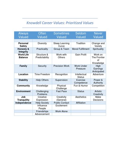 So, what exactly are career values? Simply put, they are the fundamental beliefs and principles that are most important to you when it comes to your work. They influence how you want to be treated, what kind of environment you thrive in, and what kind of impact you want to make. For example, some people highly value autonomy and the freedom to make their own decisions, while others prioritize collaboration and being part of a strong team. Some are driven by recognition and advancement, while others seek security and stability. Understanding these intrinsic motivators is absolutely crucial because when your work aligns with your values, you’re more likely to feel engaged, fulfilled, and productive. Conversely, when there’s a clash – say, you value creativity but work in a rigid, bureaucratic environment – it can lead to frustration, burnout, and a general sense of unhappiness. The Knowdell system, often presented in a handy Knowdell career values PDF format, breaks down these complex ideas into digestible categories, making it easier for anyone to identify their top values.