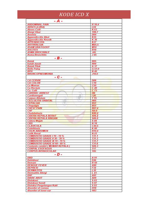 Oke, guys, sekarang kita bakal ngulik soal ICD-10 . Kalian pasti sering dengar istilah ‘ICD-10’, tapi mungkin nggak terlalu paham apa sih itu. Jadi gini, ICD-10 itu singkatan dari International Classification of Diseases and Related Health Problems, Tenth Revision . Keren kan namanya? Singkatnya, ini adalah sebuah sistem klasifikasi diagnosis medis yang dibuat sama World Health Organization (WHO). Pikirin aja kayak kamus besar buat semua penyakit, cedera, gejala, dan penyebab kematian yang ada di dunia. Setiap kondisi kesehatan dikasih kode unik yang terdiri dari huruf dan angka. Misalnya, flu biasa bisa punya kode A15.9, nah, tetanus bisa punya kode A27.0. Pokoknya, semua ada kodenya!