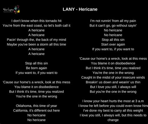 Let’s zoom in on some of the key lines from “Hericane” to really get a feel for what LANY is putting down. Take the opening line, “ I didn’t see you coming .” Simple, right? But it sets the stage for the whole song. It’s about being caught off guard by love, not expecting it, and then BAM – it hits you like a ton of bricks. Then there’s the line, “ Now I don’t know who I am without you .” Woah, heavy stuff! This speaks to how deeply intertwined we can become with someone else. It’s that feeling of losing your sense of self in the relationship, for better or worse. And let’s not forget, “ You’re my hericane, baby .” Here, they’re using the hurricane as a metaphor. It’s not just any storm; it’s their storm. It’s chaotic, powerful, and life-altering. It encapsulates the intensity of the relationship and the impact it has on their life. Each line is carefully crafted to contribute to the overall narrative of the song, creating a cohesive and emotionally resonant experience for the listener. These aren’t just random words thrown together; they’re deliberate choices that amplify the impact of the song. The repetition of certain phrases, like “ Hericane, baby ,” acts as a hook, drawing the listener deeper into the emotional core of the song. It’s a technique that LANY uses effectively to create a sense of familiarity and connection with their audience. The use of simple language also makes the lyrics accessible to a wide range of listeners. There are no complex metaphors or obscure references; it’s all straightforward and relatable, allowing people to easily connect with the emotions being expressed. Ultimately, these key lines work together to create a powerful and lasting impression, solidifying “Hericane” as one of LANY’s most memorable tracks. By understanding the significance of each line, we can gain a deeper appreciation for the artistry and emotional depth of the song.