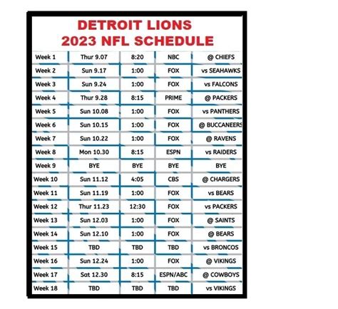 Why should you care about getting your hands on a Detroit Lions printable schedule ? Well, a printable schedule is more than just a list of game dates; it’s your command center for all things Lions. Imagine this: you’ve got the schedule right there, in front of you, and you can easily see every game, every time, and against whom. No more scrambling to find the information online or missing a game because you forgot the date. It’s about staying connected to the team you love! Keeping track of the Lions’ games is a crucial task for any dedicated fan. Having a physical schedule allows you to easily plan your week, coordinate game-watching parties, and make sure you’re always in the know. You can track their journey throughout the season. Having a physical copy means you’re less likely to miss important dates or games. In a world dominated by digital devices, there’s something genuinely satisfying about having a tangible schedule you can mark up, highlight, and personalize. This schedule becomes a part of your daily life. It is something you look at and build your life around. Whether you’re a casual fan or a die-hard supporter, the printable schedule helps you stay engaged and enjoy the entire season to the fullest. Think about the convenience. You don’t have to rely on your phone or computer to check the schedule. You have everything you need right at your fingertips. It is a fantastic way to show your team spirit. Consider printing multiple copies – one for home, one for work, and maybe even one for your friends. Share the Lions love! It is a simple tool that makes a huge difference in how you follow and enjoy the season.