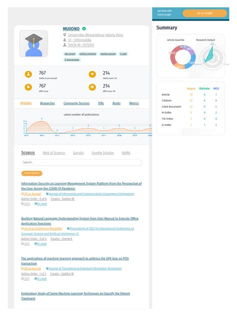 Sinta provides a rich dataset for researchers to analyze their publication performance, citations, and other metrics. Machine Learning can enhance these by: Predicting Citation Counts: Using past citation data, ML models can estimate how many times a paper will be cited. This helps researchers gauge the potential impact of their work and measure it against other publications. Identifying Research Trends: ML can analyze citation networks and publication data to identify emerging research areas and trends, helping researchers stay up-to-date and spot new opportunities. Author Ranking and Impact Assessment: ML can create rankings based on metrics and factors like publication numbers, citation counts, and the quality of the journals where articles appear. Detecting Plagiarism and Duplicate Publications: ML algorithms can detect instances of plagiarism and identify publications that may have been duplicated, ensuring the integrity of the research output. Generating Personalized Recommendations: ML systems can suggest relevant research areas, journals, or collaboration opportunities based on an author’s publication history. By using ML on Sinta data, you can improve the quality and influence of research. These insights can also help researchers make informed decisions, improve their research impact, and gain recognition within the Indonesian academic system. Machine Learning helps you become a better, more impactful researcher by providing you with the data and insights to make smart decisions.