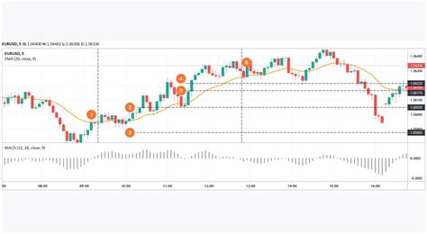 • MACD (Moving Average Convergence Divergence): The MACD is a trend-following momentum indicator that shows the relationship between two moving averages of a security’s price. The MACD line is calculated by subtracting the 26-period EMA from the 12-period EMA. A 9-period EMA of the MACD line is then plotted as the signal line, which can act as a trigger for buy and sell signals. When the MACD line crosses above the signal line, it can indicate a bullish signal, while a cross below can indicate a bearish signal. The MACD is particularly useful in identifying potential trend changes and can be used to confirm signals from other indicators. In 5-minute trading, the MACD can help you quickly identify potential entry and exit points based on short-term trend changes. Pay attention to divergences between the price and the MACD, as these can be powerful signals of potential trend reversals.
