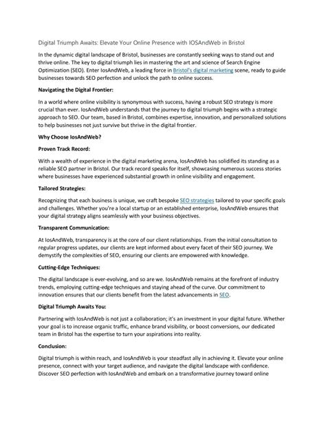Master Your Online Presence: Digital Success AwaitsOur digital world is constantly evolving, guys, and if you’re not actively managing your online presence , you’re simply missing out on massive opportunities. Think about it: whether you’re running a bustling business, launching a personal brand, or just trying to get your message out there, your digital footprint is often the first impression someone gets of you. It’s not just about having a website or a social media profile; it’s about curating a comprehensive, impactful, and easily discoverable presence that genuinely reflects who you are and what you offer. This isn’t just a fancy term; it’s your virtual storefront, your digital handshake, and your reputation rolled into one. In today’s hyper-connected landscape, a strong online presence is absolutely non-negotiable for success. We’re going to dive deep into how you can not only establish but also optimize your digital footprint to truly stand out, connect with your audience, and achieve your goals. Get ready to transform how you’re seen and found online!## Unlocking Your Digital Potential: Why Online Presence Matters More Than EverGuys, let’s get real about online presence – it’s no longer a nice-to-have; it’s a fundamental pillar of existence for anyone looking to make a mark in the modern world. Your online presence encompasses everything from your website and social media profiles to online reviews, search engine results, and even mentions in digital articles or forums. It’s essentially your digital reputation and your primary vehicle for visibility in a world that increasingly turns to the internet for information, products, and services. Imagine someone searching for a business like yours, or a professional with your skills; if you’re not easily discoverable, or if your digital footprint is weak, you’re practically invisible. This is why optimizing your online presence is paramount. It allows you to build trust and credibility, especially in an era where consumers are savvier than ever and perform extensive research before making decisions. A robust online presence lets you showcase your expertise, share your unique story, and establish yourself as an authority in your niche, making it much easier for potential customers or collaborators to choose you over the competition. Furthermore, a strong online presence enables direct communication with your audience, fostering community and feedback that can be invaluable for growth and adaptation. You can engage with comments, respond to queries, and even gather insights that inform your future strategies, making your brand more responsive and customer-centric. Without a doubt, neglecting your digital identity means you’re leaving countless opportunities on the table, from lead generation and sales to networking and brand loyalty, making a proactive and well-thought-out approach to your online presence an absolute necessity for anyone serious about achieving their objectives in the digital age. It’s about being accessible, authoritative, and authentic in the vast digital landscape, ensuring you’re not just present online, but truly performing .## Building Your Digital Home: Crafting an Amazing WebsiteYour website, folks, is truly the cornerstone of your online presence . Think of it as your primary digital real estate, the one place online where you have complete control over your message, branding, and user experience. Building an amazing website isn’t just about pretty pictures; it’s about creating an intuitive, informative, and engaging platform that effectively communicates your value proposition and guides visitors towards your desired actions, whether that’s making a purchase, signing up for a newsletter, or contacting you directly. A well-designed website starts with a user-centric approach , meaning you need to consider who your audience is, what they’re looking for, and how they navigate online. This involves clear, concise content, easy-to-use navigation menus, and a visually appealing layout that aligns with your brand identity. But it’s not just aesthetics; the technical foundation is equally critical. Your website absolutely must be mobile-responsive , as a significant portion of internet traffic now comes from smartphones and tablets. If your site looks broken or is difficult to use on a mobile device, visitors will bounce faster than you can say “digital marketing.” Load speed is another critical factor; slow-loading sites frustrate users and negatively impact your search engine rankings, so optimizing images and code is a must. Beyond the technical aspects, a great website is also a content hub , offering valuable information that positions you as an expert and keeps visitors engaged. This could include blog posts, case studies, product descriptions, or portfolio pieces. Ensuring your site is easy to update and maintain is also crucial for long-term success, as your business and offerings will undoubtedly evolve. Investing in a professional, functional, and user-friendly website is one of the smartest decisions you can make for your online presence , serving as a reliable home base for all your digital marketing efforts and truly setting the stage for digital success. It’s your 24 7 salesperson, information desk, and brand ambassador, all rolled into one powerful digital asset that supports and amplifies every other aspect of your online strategy.## Get Found Online: The Magic of SEOAlright, guys, you can have the most beautiful website and the most compelling content, but if nobody can find it, what’s the point, right? This is where the magic of SEO , or Search Engine Optimization, swoops in to save the day. SEO is the process of optimizing your website and online content to rank higher in search engine results pages (like Google, Bing, or Yahoo) for relevant keywords. Simply put, when potential customers are searching for products, services, or information rela