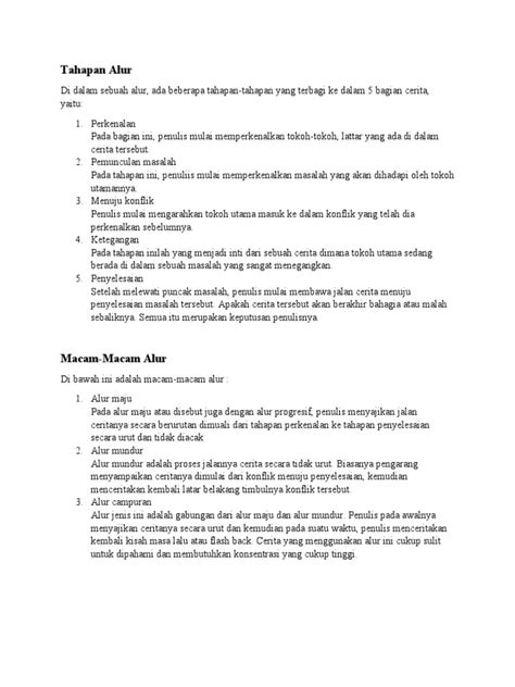 Nah, guys, biar makin ngerti soal alur dalam cerpen , kita perlu tahu juga nih ada beberapa jenis alur yang sering dipakai sama penulis. Masing-masing punya ciri khasnya sendiri dan bikin cerita jadi punya ‘rasa’ yang beda. Yang pertama dan paling umum itu ada yang namanya alur maju atau progresif . Sesuai namanya, alur ini berjalan lurus dari awal cerita sampai akhir. Kejadiannya berurutan secara kronologis, dari masa lalu ke masa kini, lalu ke masa depan. Pembaca bakal ngikutin perjalanan tokoh dari A ke B, terus ke C, tanpa ada lompatan waktu yang membingungkan. Cerita yang pakai alur maju ini biasanya terasa lebih realistis dan mudah diikuti. Cocok banget buat kalian yang suka cerita yang alurnya jelas dan nggak bikin pusing mikir. Contohnya kayak cerita sehari-hari tentang perjuangan seorang anak sekolah meraih mimpinya, dari dia mulai kesulitan sampai akhirnya berhasil. Semuanya mengalir begitu saja, tanpa perlu kita bolak-balik waktu.