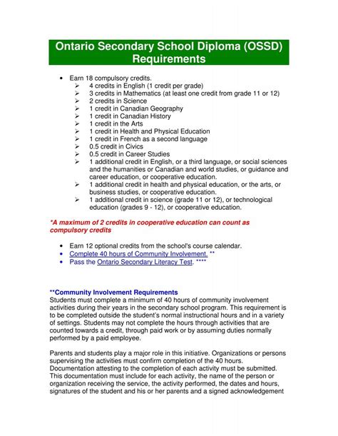 Alright, so you wanna know what it takes to snag that OSSD ? It’s not just about showing up to class, though that’s a good start! The Ontario Secondary School Diploma has some pretty clear requirements, and they’re designed to make sure you’re well-rounded and ready for whatever comes next. First off, you need to earn a minimum of 30 credits. What’s a credit, you ask? Well, it’s essentially a credit for a course you successfully complete. Most high school courses in Ontario are worth one credit each. So, yeah, 30 courses successfully completed. But it’s not just about quantity; there’s quality involved too! You need to complete your Grade 12 year, which is a given, but more importantly, you need to achieve a certain level of proficiency. This means passing your courses, obviously, but the OSSD also has specific compulsory credits you must obtain. These cover a range of subjects to ensure you get a broad education. Think English, a second language, math, science, Canadian history, Canadian geography, the arts, physical education, and civics. It’s all about giving you a solid foundation, guys. On top of these compulsory credits, you also need to choose some optional credits to broaden your horizons and tailor your education to your interests. And don’t forget the Literacy Requirement ! This is a big one. You have to pass the Ontario Secondary School Literacy Test (OSSLT) or an equivalent Grade 12 literacy course. This test basically assesses your ability to read, understand, and use information found in typical everyday contexts, and to communicate information clearly in writing. It’s a crucial step to ensure you have those essential literacy skills. So, yeah, it’s a structured path, but it’s totally achievable with focus and effort!