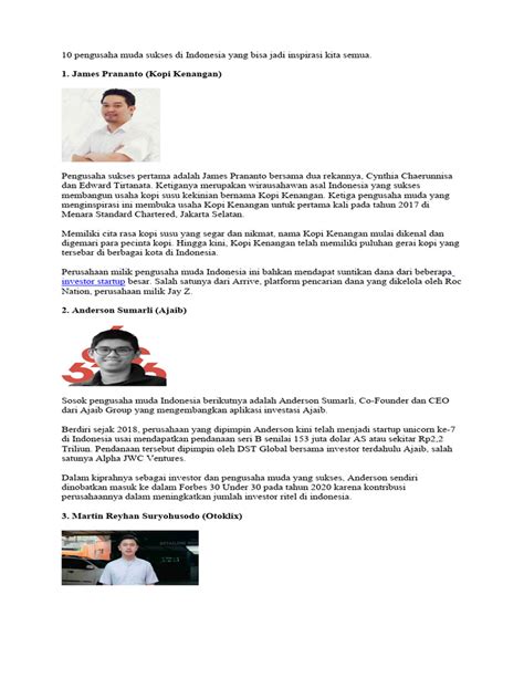 Yo, guys! Pernah kepikiran nggak sih, gimana rasanya jadi pengusaha muda yang sukses di Indonesia? Pasti keren banget ya, bisa ngembangin bisnis sendiri dari nol, terus bikin dampak positif buat banyak orang. Nah, di artikel ini, kita bakal ngobrolin beberapa tokoh wirausahawan muda yang sukses di Indonesia . Mereka ini bukan cuma sekadar punya ide brilian, tapi juga punya semangat juang yang luar biasa, kegigihan yang nggak main-main, dan kemampuan adaptasi yang top banget. Kita bakal kupas tuntas kisah inspiratif mereka, mulai dari tantangan yang dihadapi, strategi jitu yang dipakai, sampai tips-tips berharga buat kalian yang juga lagi merintis jalan jadi pengusaha.