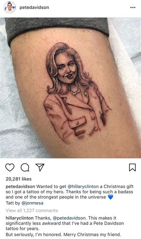 The Hillary Clinton tattoo, while seemingly a simple act, speaks to a broader cultural trend. It shows how the lines between celebrity culture, politics, and personal expression continue to blur. Pete Davidson, with his tattoos, his dating history, and his comedic persona, is a prime example of someone who embraces this intersection. His willingness to express himself through body art, coupled with his high profile, makes his choices a subject of fascination. The tattoo encourages people to explore their own values and consider their personal role in the political landscape. By getting a tattoo of a political figure, Pete is participating in a dialogue, which includes the intersection of pop culture and politics. It serves as a reminder of how intertwined public figures and personal expression can become in the modern era. The tattoo also raises questions about the use of tattoos as a tool for political statements. It shows how people use art to engage with the world around them.