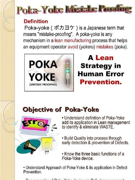 So, what in the world is Poka-Yoke ? It’s a Japanese term that roughly translates to “mistake-proofing” or “error-proofing.” Developed by Shigeo Shingo, a Japanese industrial engineer, Poka-Yoke is all about designing processes and systems in a way that makes it impossible (or at least very difficult) for mistakes to happen. Think of it like a built-in safety net for your work. The goal is to eliminate defects at the source, preventing them from ever reaching the customer. This approach is a cornerstone of lean manufacturing and is all about improving quality, reducing waste, and boosting overall efficiency. Poka-Yoke isn’t just a set of tools; it’s a mindset, a commitment to continually improving and refining processes to catch errors before they occur. It’s about designing systems with human error in mind, accepting that mistakes will happen, and building in safeguards to prevent them from causing problems. The beauty of Poka-Yoke lies in its simplicity and effectiveness. It often involves simple, low-cost solutions that make a big impact. Instead of relying on inspection and detection after a mistake has been made, Poka-Yoke focuses on prevention. By preventing errors in the first place, you save time, money, and headaches, and that’s something we can all get behind. It is about implementing a mechanism to prevent an error from occurring, or if it does, to make it immediately obvious. This could involve physical devices, visual cues, or even automated checks. By taking a proactive approach to error prevention, you can dramatically improve the reliability and efficiency of your processes. Poka-Yoke is about finding the root cause of errors and designing solutions that address those root causes directly. This approach is more effective than simply treating the symptoms of the problem. It requires a deep understanding of the process and a willingness to challenge the status quo. In a world where perfection is the standard, Poka-Yoke is the tool that helps us achieve it, or at least get pretty darn close. It’s the secret sauce that transforms good processes into great ones.