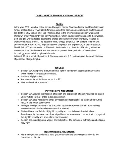 At the heart of the Shreya Singhal case was the notorious Section 66A of the Information Technology Act, 2000 . This section, guys, was the real culprit, and understanding its problematic nature is key to grasping the significance of the Supreme Court’s ruling. Enacted in 2008 as an amendment to the IT Act, Section 66A made it an offense to send, by means of a computer resource or a communication device, any information that was (a) grossly offensive or had a menacing character ; or (b) any information which the sender knew to be false, but for the purpose of causing annoyance, inconvenience, danger, obstruction, insult, injury, criminal intimidation, enmity, hatred or ill will , persistently by making use of such computer resource or a communication device; or © any electronic mail or electronic message for the purpose of causing annoyance or inconvenience or to deceive or to mislead the recipient or to make him believe that such a message originates from a different person. The penalties for these offenses included imprisonment for a term which could extend to three years and with fine. Now, if you read that, you might immediately notice how vague and broad these terms are. What exactly constitutes “grossly offensive”? Who decides what has a “menacing character”? And what about causing “annoyance” or “inconvenience”? These terms are highly subjective and open to wide interpretation, which is precisely why they became so problematic. This lack of precision gave law enforcement authorities an almost unchecked power to arbitrarily arrest individuals for posting content that might simply be critical, satirical, or even just unpopular. We saw numerous instances where individuals were arrested for seemingly innocuous social media posts, like expressing dissent against a political figure, criticizing government policies, or even just sharing cartoons. For example, two young women were arrested in 2012 for posting comments on Facebook questioning the Mumbai bandh after Shiv Sena leader Bal Thackeray’s death. Another case involved a professor who was arrested for forwarding a cartoon mocking a political figure. These incidents highlighted the draconian nature of Section 66A and its potential to crush legitimate online discourse. It essentially created a “chilling effect,” where people self-censored their opinions out of fear of legal action, even if their posts were well within the bounds of constitutional free speech. This was a direct threat to the freedom of expression that our Constitution guarantees, and it prompted the urgent need for judicial intervention. The section essentially allowed for punishment based on the impact a message had on the recipient, rather than its intent or objective content, which is a dangerous precedent in free speech jurisprudence. The arguments against Section 66A centered on its fundamental violation of Article 19(1)(a) – the right to freedom of speech and expression – and its failure to meet the requirements of reasonable restrictions under Article 19(2). It was seen as an overbroad, arbitrary, and disproportionate restriction on online speech, making it ripe for a constitutional challenge.