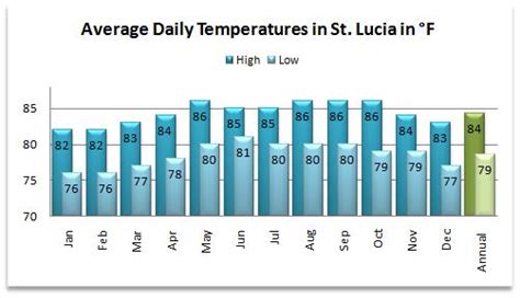 As mentioned earlier, St. Lucia maintains a consistent temperature throughout the year. The average daytime temperature ranges from 82°F to 86°F (28°C to 30°C). Nighttime temperatures typically drop to around 73°F to 77°F (23°C to 25°C). These temperatures are relatively stable, making St. Lucia a comfortable destination no matter when you visit. The consistent warmth is a major draw for tourists seeking a tropical escape.