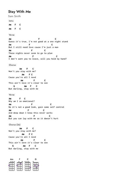 Hey guys! Ever wanted to learn how to play “Stay With Me” on your ukulele? You’re in luck! This guide will walk you through the chords, strumming patterns, and tips you need to start playing this awesome song. Whether you’re a beginner or have been strumming for a while, this guide will help you nail it. So, grab your ukulele, and let’s dive into the world of Sam Smith’s “Stay With Me” ! We’ll break down everything step-by-step, making it super easy to follow along. Get ready to impress your friends and maybe even serenade someone special! Learning to play songs like this is a fantastic way to improve your ukulele skills and have a blast doing it. Trust me, it’s way more fun than just practicing scales all day! Let’s get started and make some music!