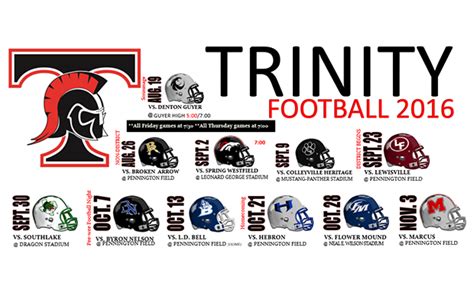 Hey sports fans! Are you hyped for the upcoming Trinity football season? We’re talking touchdowns, nail-biting finishes, and the roar of the crowd – all the good stuff! If you’re anything like me, you’re already checking your calendar, making plans, and getting ready to support your team. This comprehensive guide will be your go-to resource for everything you need to know about the Trinity football schedule . We’ll cover dates, times, opponents, and even a few insider tips to make sure you have the best possible game-day experience. So, grab your jersey, your lucky hat, and let’s dive into the exciting world of Trinity football! Get ready to mark those dates, because you won’t want to miss a single moment of the action.