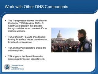 • Working with Law Enforcement: The TSA collaborates with local, state, and federal law enforcement agencies to enhance security and respond to threats.