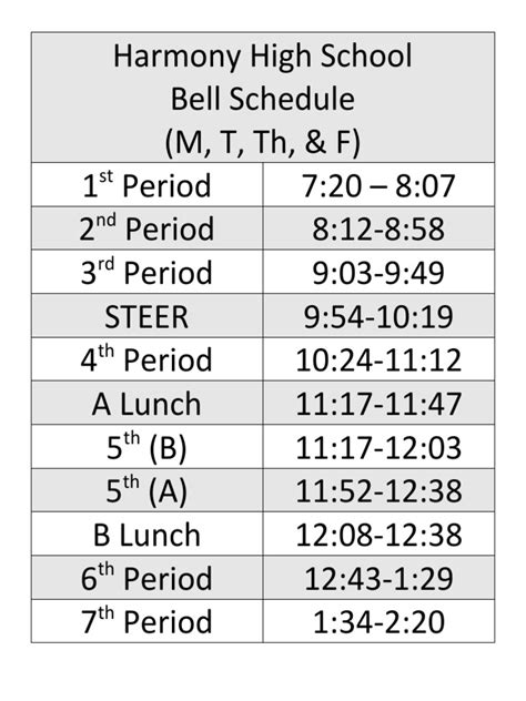The regular day schedule is the standard one you’ll follow most of the time. It usually includes seven periods, with set start and end times for each class, along with a lunch break. The timings are designed to provide a balanced learning environment, allowing enough time for each subject while also giving students breaks to recharge. Make sure you familiarize yourself with the regular schedule, as it is the foundation for your daily routine. This typically involves classes lasting around 50 minutes, with a few minutes between classes to get to your next destination. Lunch is typically a dedicated block of time, and is often split into different lunch periods depending on the grade or the courses you are taking. Stay alert for any announcements about changes to the schedule and make use of the school’s website or other communication channels.