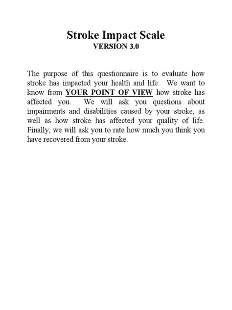 Alright, let’s get down to brass tacks: what is the Stroke Impact Scale (SIS) ? The SIS is a patient-reported outcome measure, which means it’s a questionnaire where patients share their experiences and how a stroke has affected them. It’s designed to assess various aspects of life that might be impacted by a stroke. This is a crucial element in understanding the complete picture of how the stroke is affecting an individual, from their physical capabilities to their emotional well-being. Think about all the things you do in a day—walking, talking, remembering things, even your mood. The SIS looks at all of these areas. It is the gold standard for measuring stroke recovery and the effectiveness of different treatments. The SIS helps healthcare professionals and patients see the big picture, beyond just physical symptoms. Unlike some assessments that focus solely on physical function, the SIS covers a wide range of factors, offering a more holistic view of the patient’s condition. By measuring these different areas, the SIS helps create a more well-rounded plan for stroke recovery, focusing on the areas that need the most attention. The assessment is not just about what a person can’t do anymore; it’s about what they can do, and how they feel about it. This allows doctors and therapists to tailor the recovery plan, and address the specific needs of each patient. So, in short, the Stroke Impact Scale (SIS) is your way of reporting what you’re dealing with after a stroke, helping your healthcare team help you better.