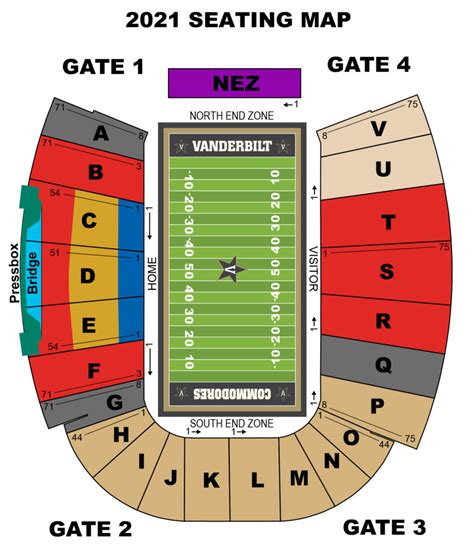 Alright, first things first: understanding the Vanderbilt Stadium seating chart is key. The stadium, which is officially known as FirstBank Stadium, is a horseshoe-shaped venue that provides a unique viewing experience. Unlike some rectangular stadiums, the design of Vanderbilt Stadium brings fans closer to the action. This intimate setting creates a fantastic atmosphere, making every game feel electric. The Vanderbilt Stadium seating chart is generally divided into several primary sections, including the North End Zone, South End Zone, East Sideline, and West Sideline. Each of these sections offers a variety of seating options, catering to different preferences and budgets. Sections are typically numbered and lettered to help you find your exact spot. It’s super important to familiarize yourself with these sections to make sure you know where your seats are located before you even get to the stadium. Trust me; it’ll save you a lot of time and potential confusion on game day. The Vanderbilt Stadium seating chart layout is pretty straightforward once you get the hang of it, and it’s designed to make it easy for everyone to find their seats. When you’re looking at the Vanderbilt Stadium seating chart , pay attention to the row numbers, too. Rows usually start closer to the field and go up as you move higher in the stands. Knowing your section, row, and seat number will be your golden ticket to your specific location. Don’t worry, there are plenty of ushers and stadium staff to help if you get lost, but knowing your way around the Vanderbilt Stadium seating chart beforehand will definitely make your experience smoother.